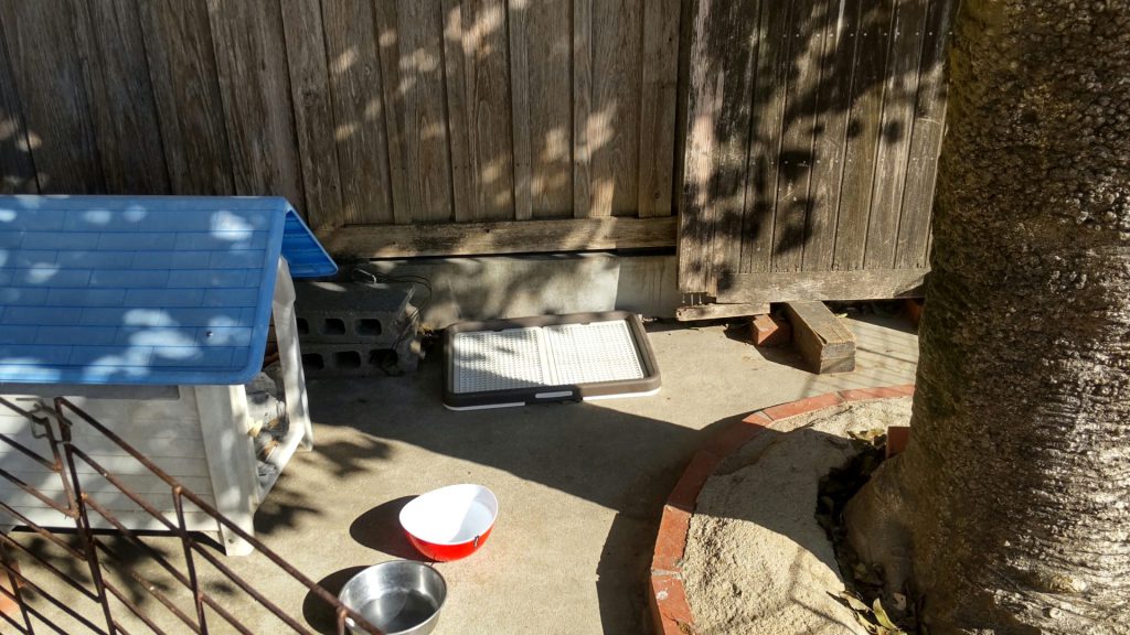 本来ならハウスに近くない場所にトイレトレーを設置したほうがよさそうですが、わんファミリーでは、サークルのスペース上、ハウスから近い場所に設置しました。