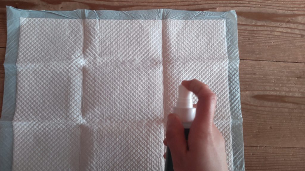 ペットシーツにトイレ学習スプレーをかけて、トレーにセットします。